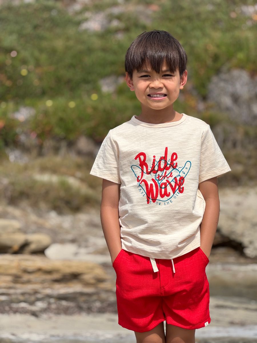 It's refreshing, fun, and full of maritime charm, the Off White colour pairs stunningly with our bold Red shorts.