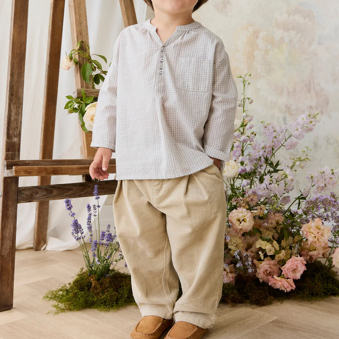 Add a touch of timeless charm to your little one’s wardrobe with our Kenji Top in Cloud Check. Featuring a classic check pattern, Henley-style button placket, and a chest pocket detail, this piece is perfect for layering or wearing on its own for a dreamy, vintage-inspired look.