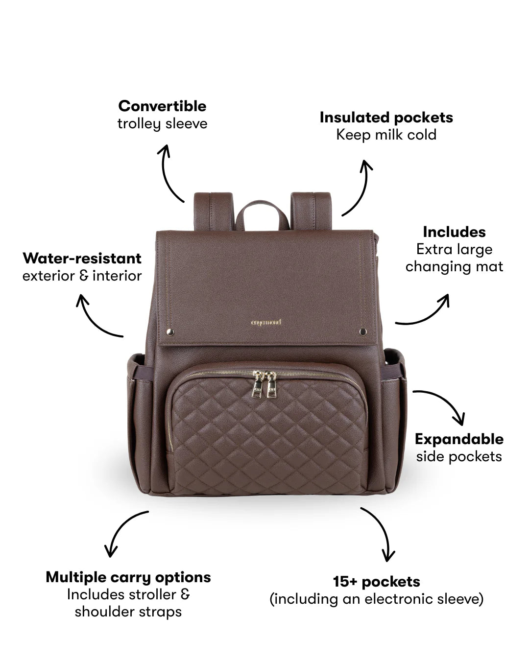 Crafted from top-grade premium vegan leather in a rich pebble finish, Luna exudes sophistication. Every detail speaks quality - from the high-grade zippers to the light gold custom-logo hardware. And for those inevitable spills and messes? The water-resistant lining has got you covered.
