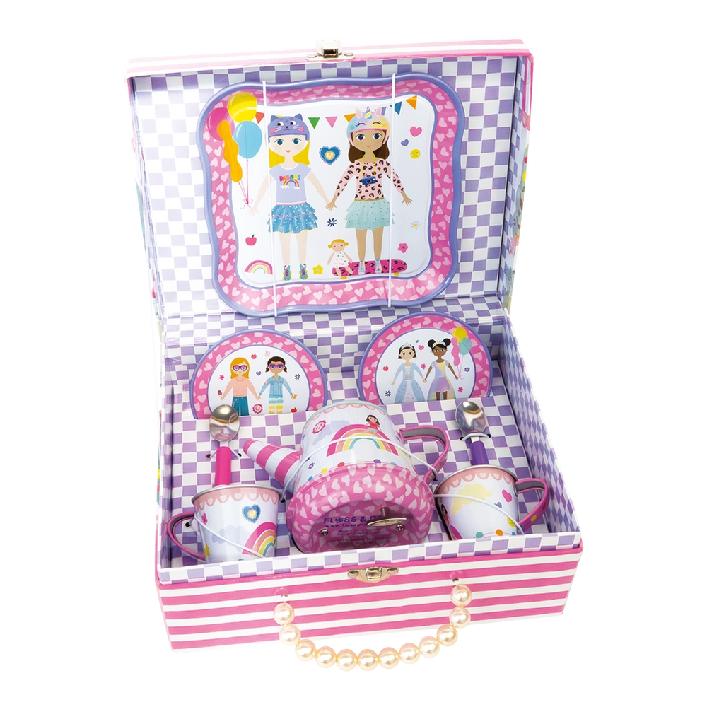 Our beautiful 9-piece Musical Best Friends Tea Set has a tea pot and lid, 2 tea cups, 2 plates and 1 tray in a gorgeous reusable carry case complete with pretty pearl handle, perfect for taking to tea parties with friends! Turn the winder underneath the teapot and pour to hear ‘It’s a small world’ play!